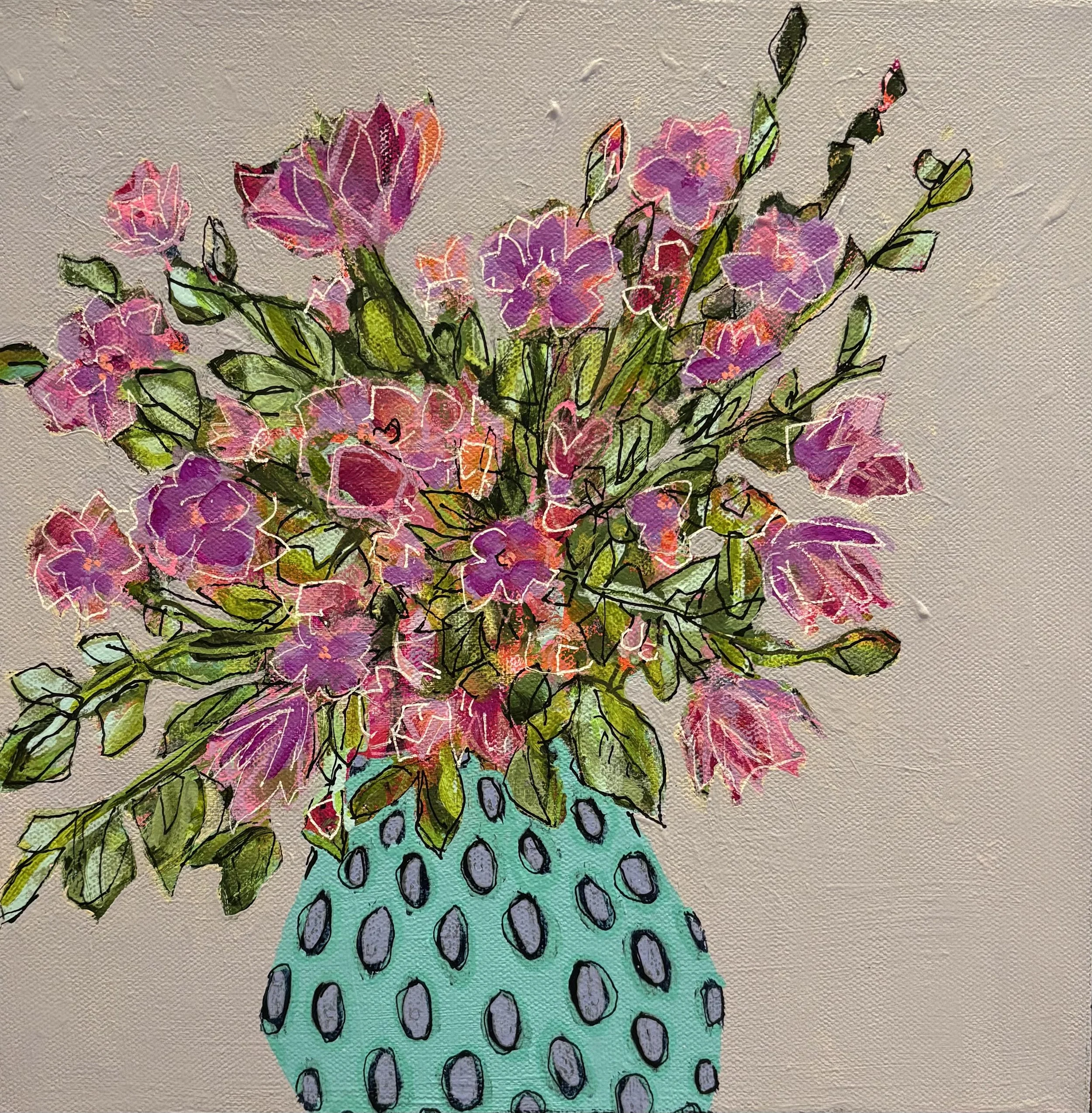 A 12”x12”x1.5” acrylic painting on gallery wrapped canvas. Edges are painted for a finished look, and back is wired for hanging.