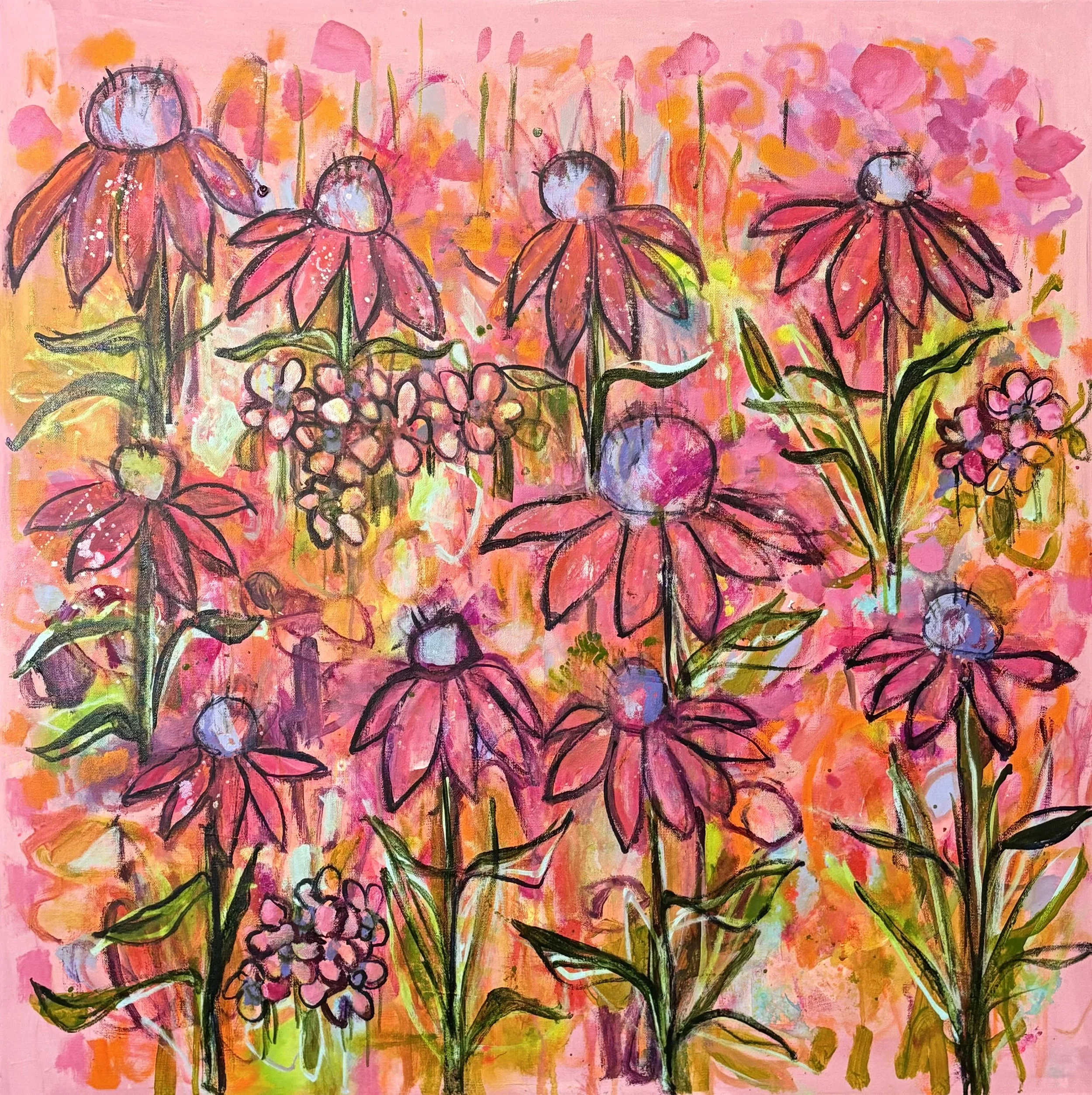A 36”x36”x1.5” acrylic painting on gallery wrapped canvas. Edges are painted for a finished look, and back is wired for hanging.