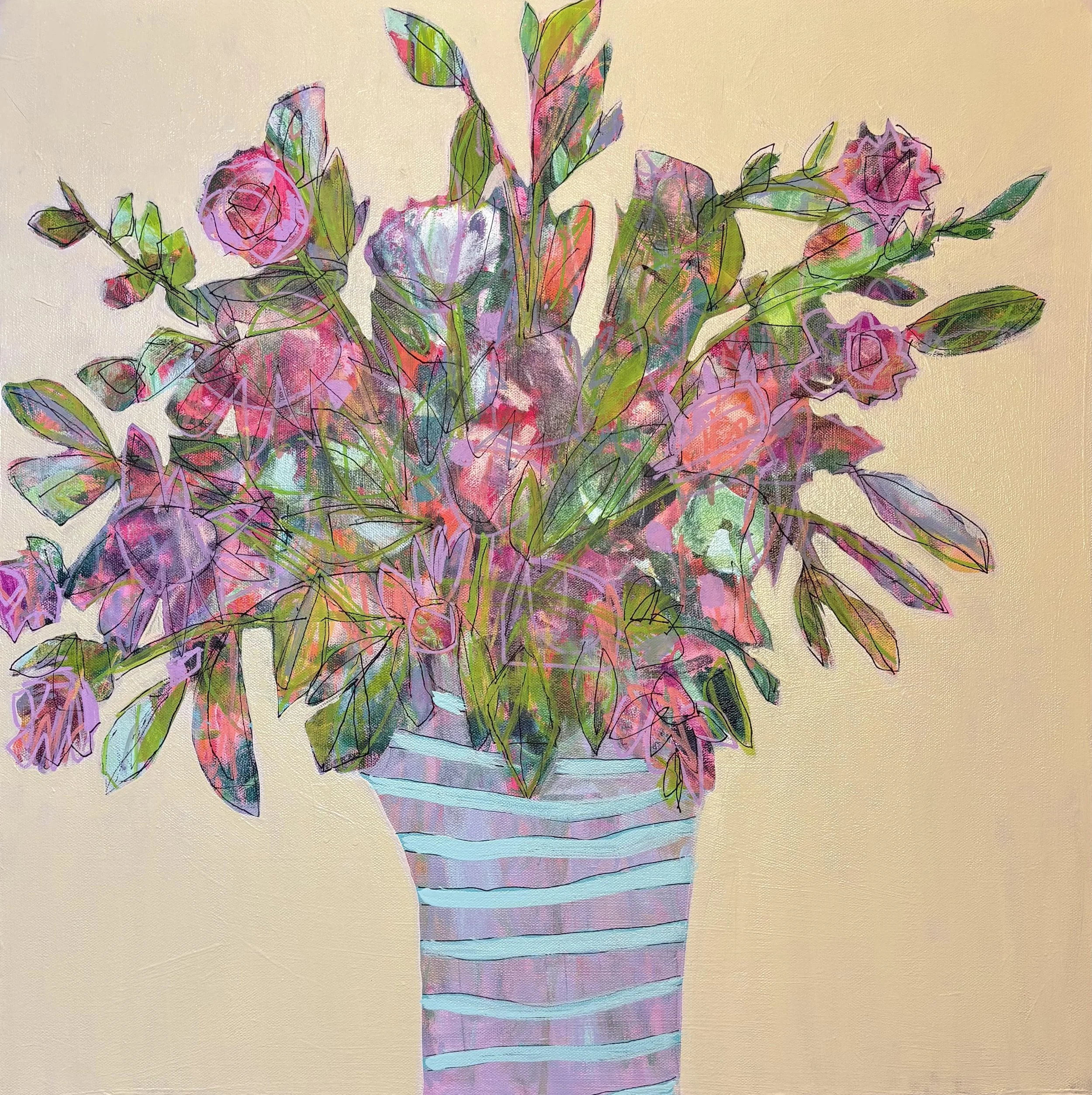 A 24”x24”x1.5” acrylic painting on gallery wrapped canvas. Edges are painted for a finished look, and back is wired for hanging.